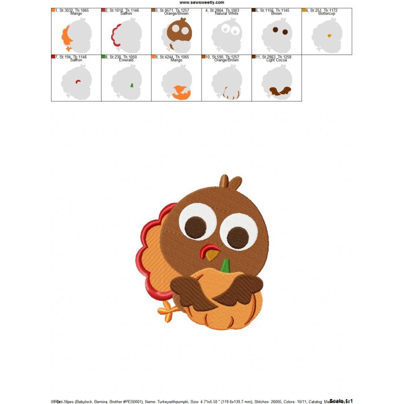 Turkey With Pumpkin Machine Embroidery Design Pattern For Fall And Thanksgiving Embroidery Projects.