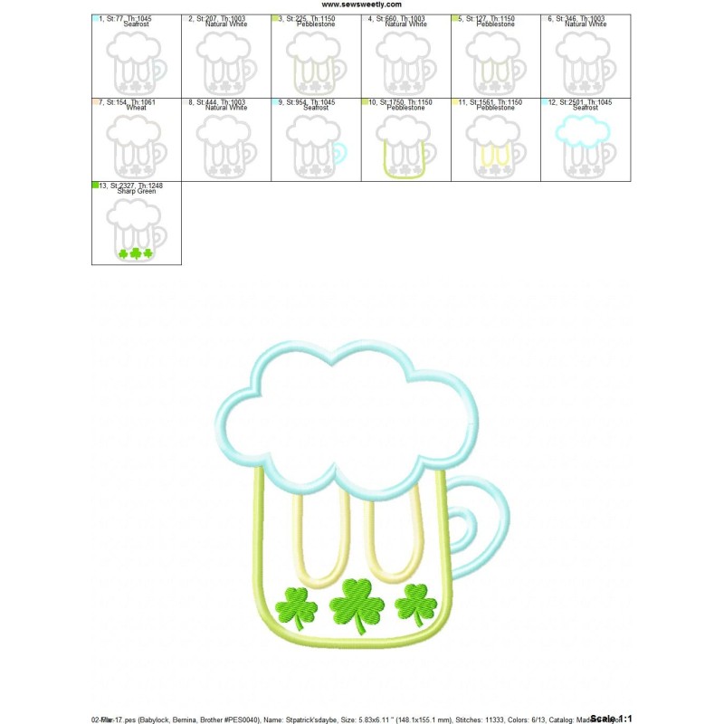 St. Patrick's Day Beer Applique Embroidery Design Pattern For Irish Machine Embroidery Projects.