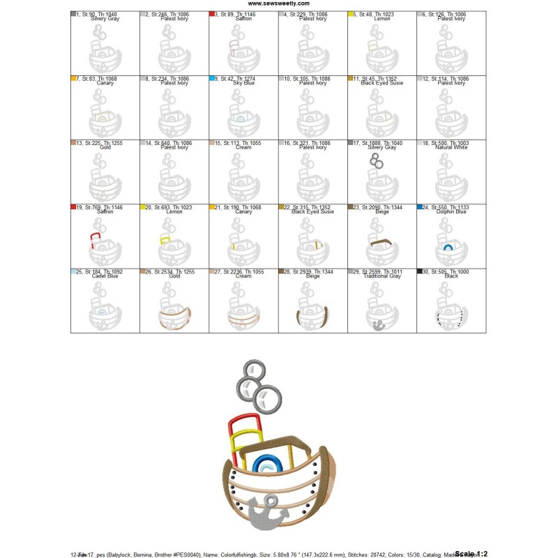 This Design Bundle Includes 5 Fishing Boats Embroidery Designs In Redwork, Applique And Filled Stitch Versions.