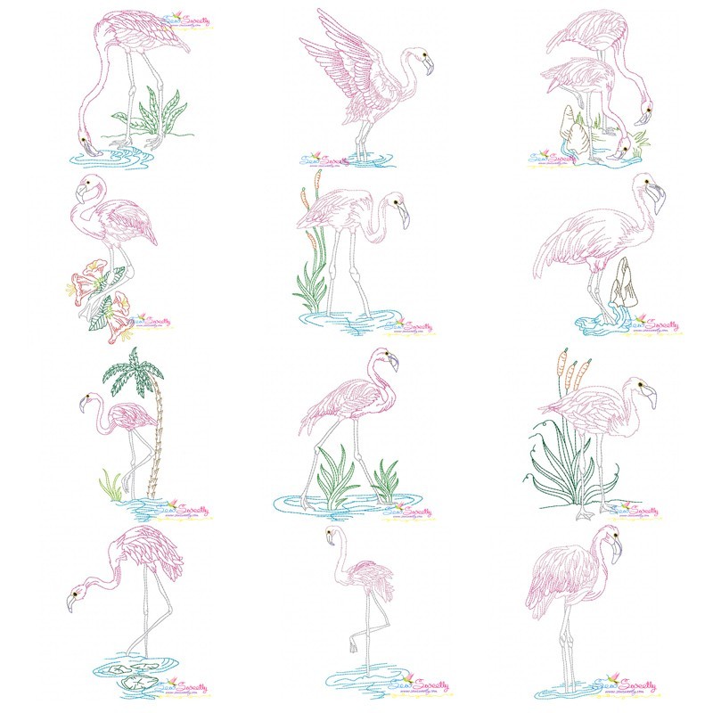 This Embroidery Design Pack Includes 12 Beautiful Triple Bean Stitch Flamingo Embroidery Designs.