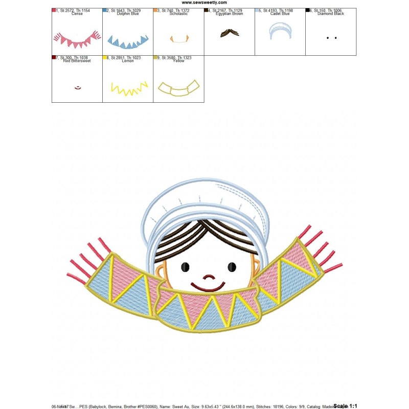 Thanksgiving Pilgrim Girl Scarf Embroidery Design Pattern.