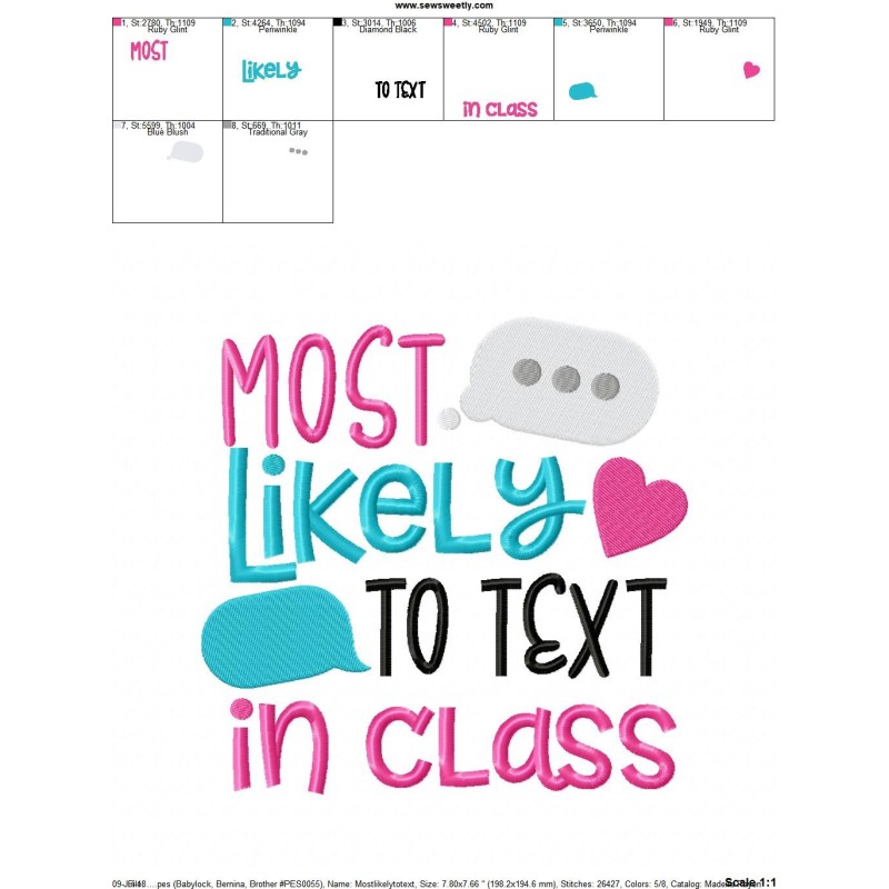 Most Likely To Text In Class Machine Embroidery Design Pattern For Back To School Projects.