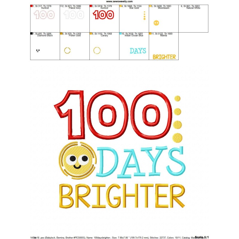 100 Days Brighter Machine Embroidery Applique Design Pattern For Back To School Projects.