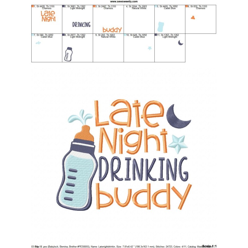 Late Night Drinking Buddy Machine Embroidery Design Pattern For Kids.