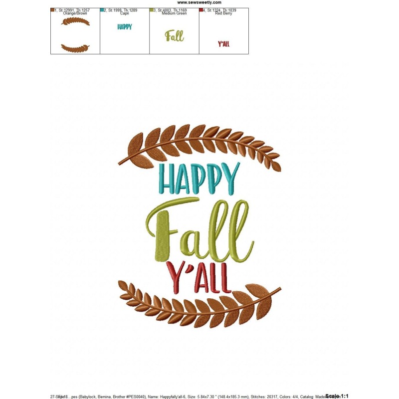 Happy Fall Y'all-2 Machine Embroidery Design Pattern For Fall And Thanksgiving.
