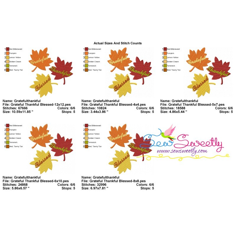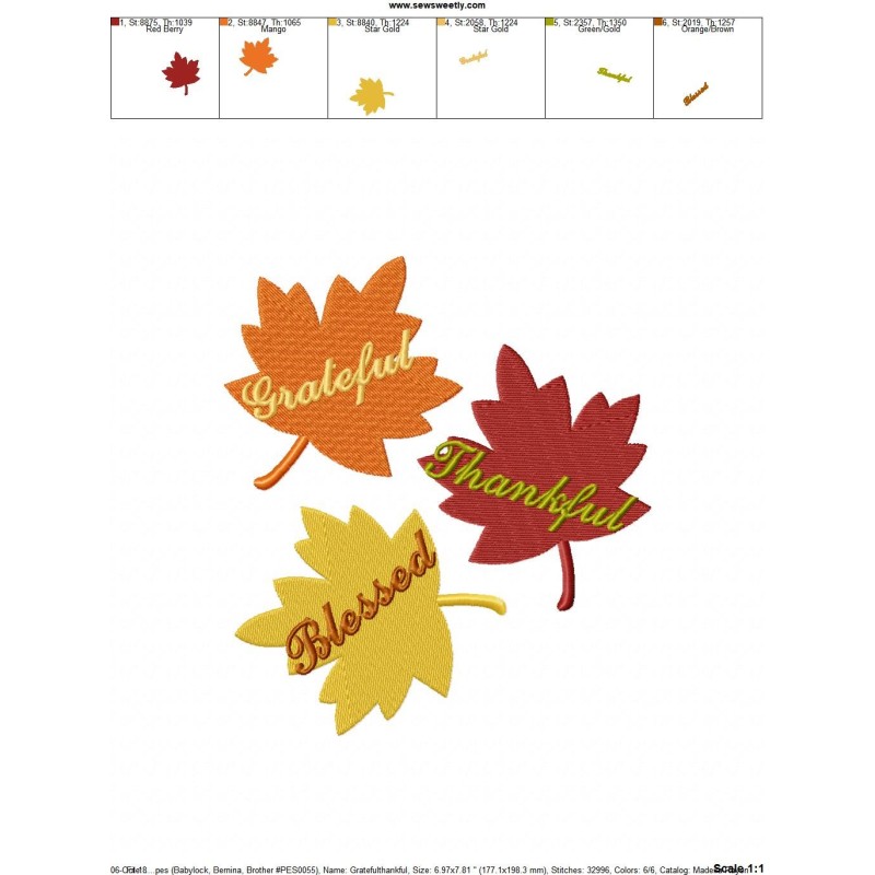 Grateful Thankful Blessed Leaves Machine Embroidery Design Pattern For Fall And Thanksgiving.