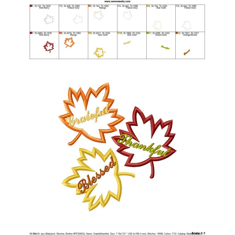 Grateful Thankful Blessed Leaves Machine Embroidery Applique Design Pattern For Fall And Thanksgiving.