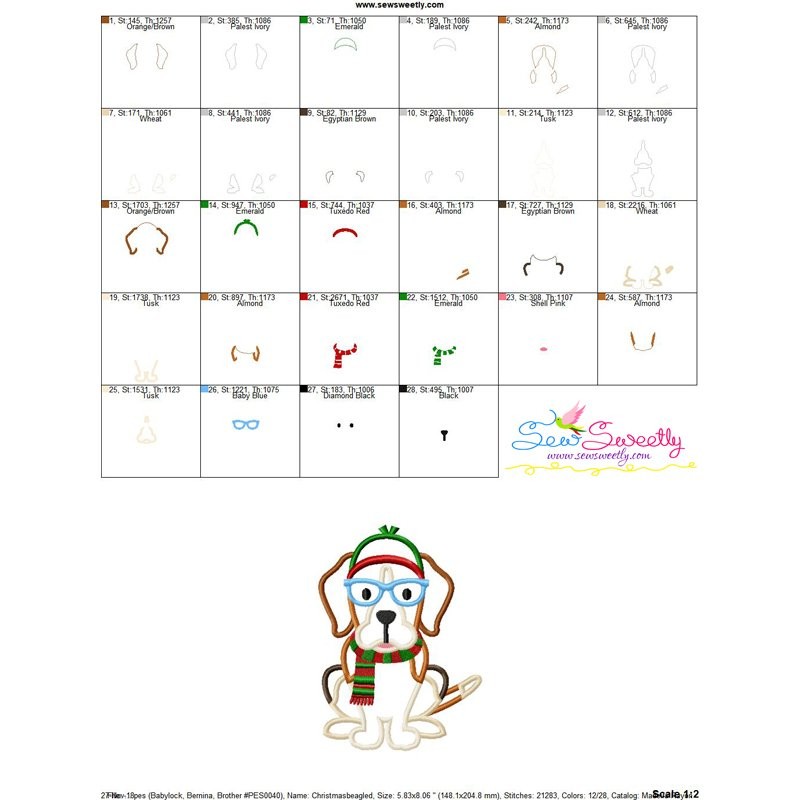 Christmas Beagle Dog Glasses Applique Design Pattern