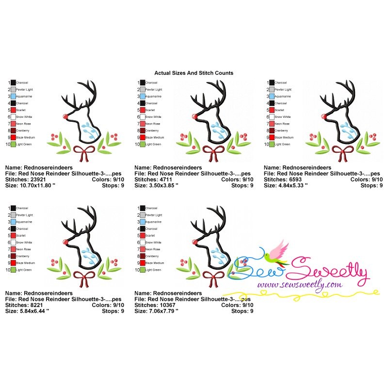 Red Nose Reindeer Silhouette-3 Machine Embroidery Applique Design Pattern For Christmas.