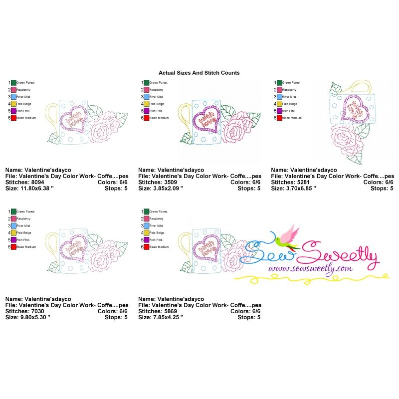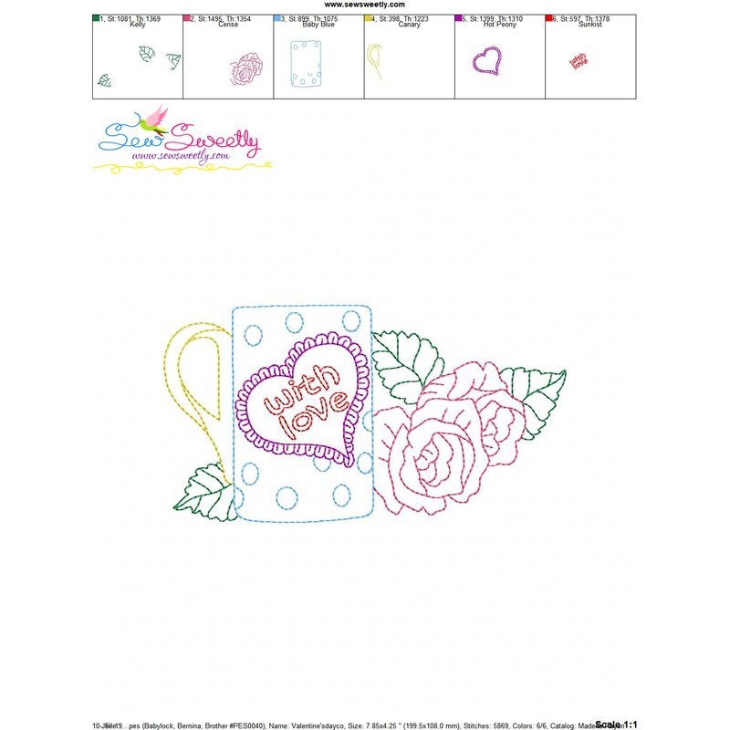 Valentine's Day Color Work- Coffee Cup Roses Machine Embroidery Design Pattern For Valentine's Day.