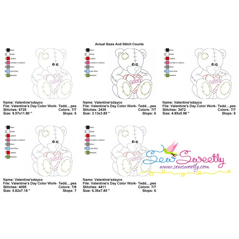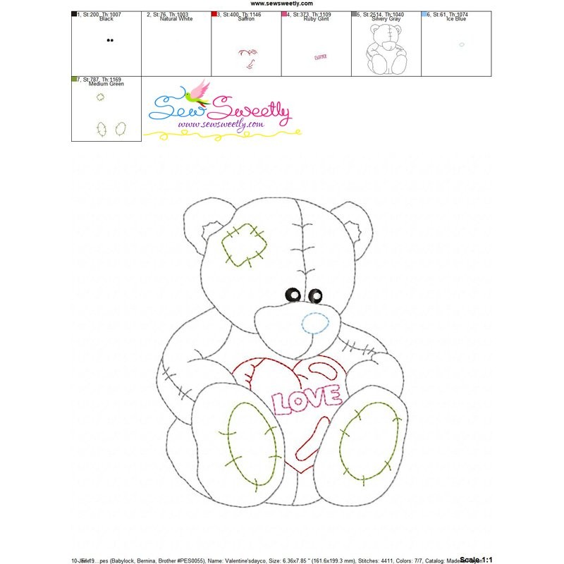 Valentine's Day Color Work- Teddy Bear Machine Embroidery Design Pattern For Valentine's Day.
