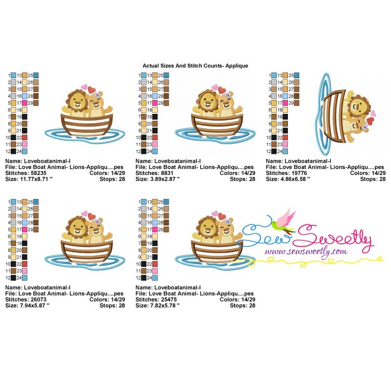 Love Boat Animal- Lions Machine Embroidery Applique Design Pattern For Valentine's Day.