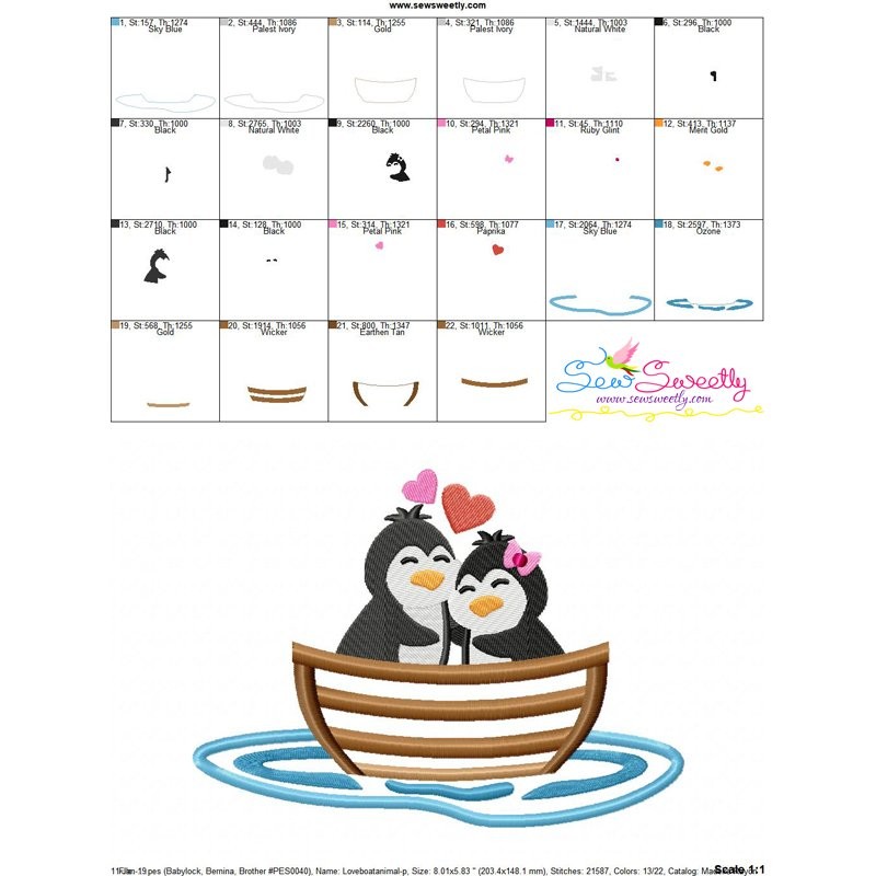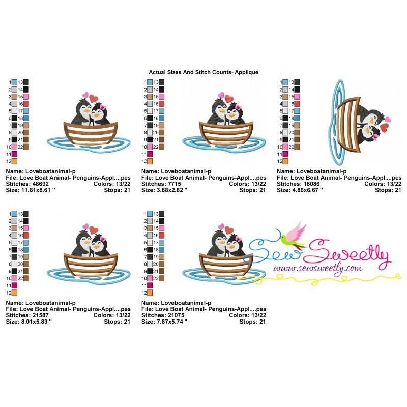 Love Boat Animal- Penguins Machine Embroidery Applique Design Pattern For Valentine's Day.