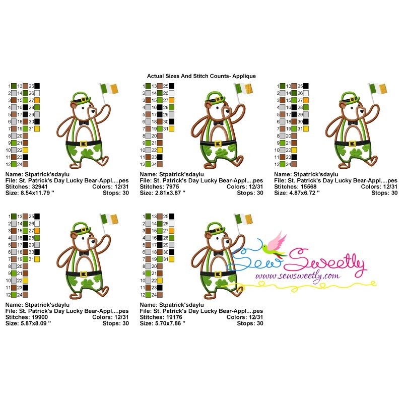St. Patrick's Day Lucky Bear Machine Embroidery Applique Design Pattern For St. Patrick's Day.