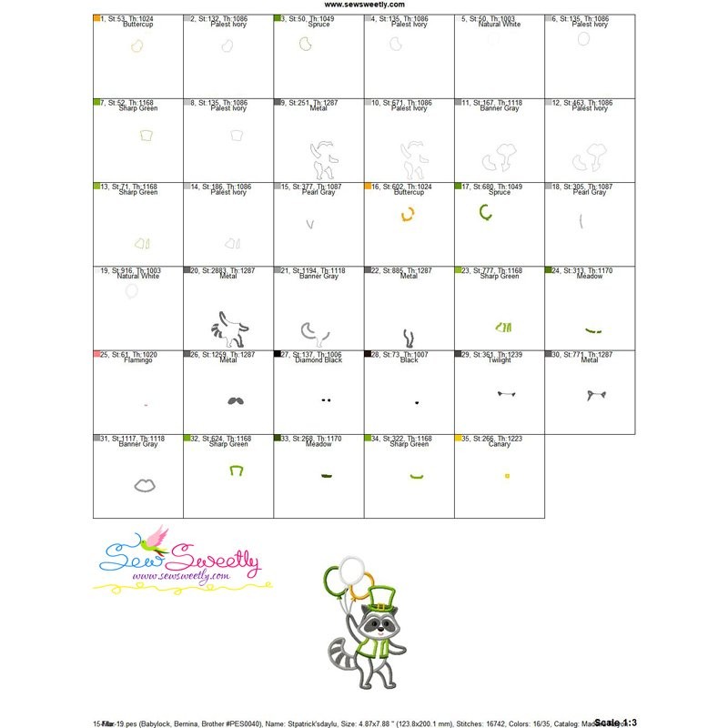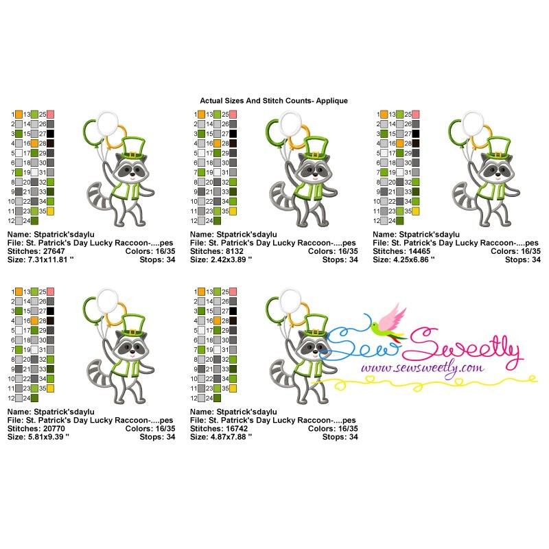 St. Patrick's Day Lucky Raccoon Machine Embroidery Applique Design Pattern For St. Patrick's Day.