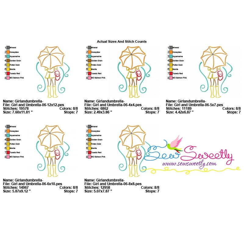 Girl and Umbrella-6 Machine Embroidery Design Pattern For Rainy Season.