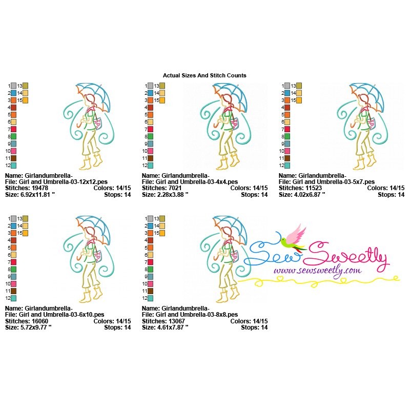 Girl and Umbrella-3 Machine Embroidery Design Pattern For Rainy Season.