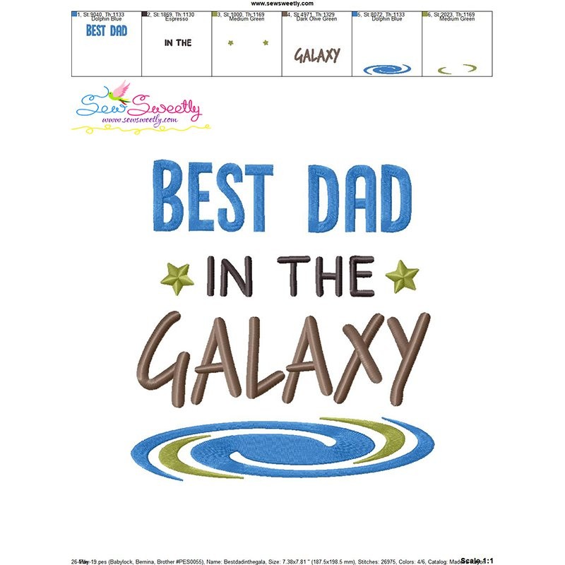 Best Dad in The Galaxy Lettering Machine Embroidery Design Pattern For Father's Day.