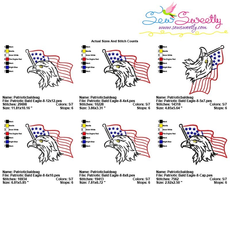 Patriotic Bald Eagle-8 Machine Embroidery Design Pattern For 4th of July Independence Day. Cap Size Is Included!