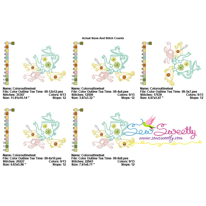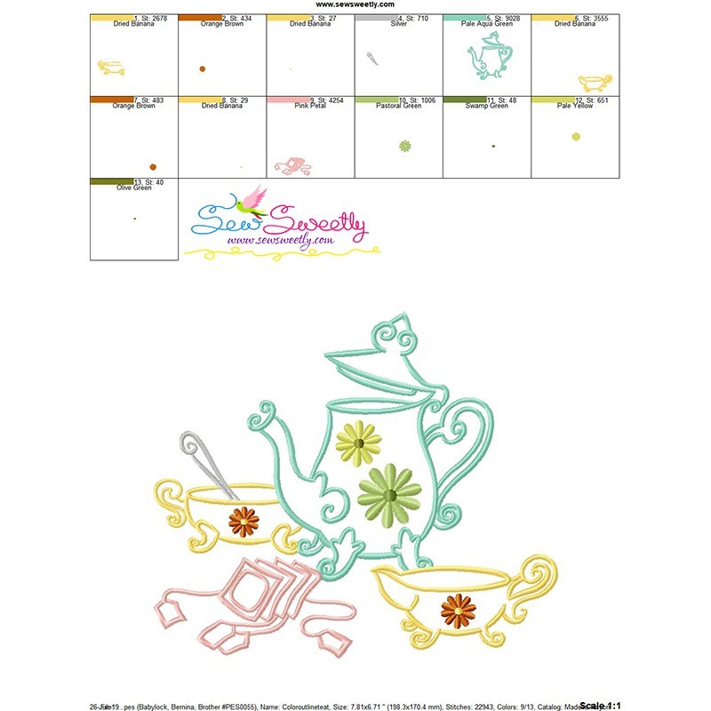 Color Satin Stitches Tea Time-9 Machine Embroidery Design Pattern.