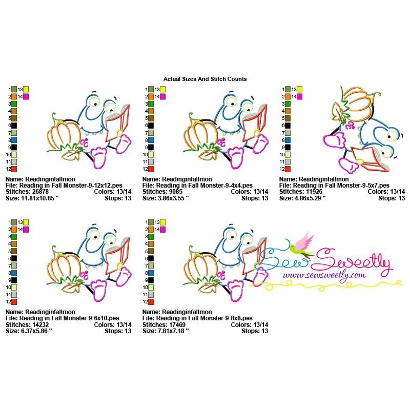 Reading in Fall Monster-9 Machine Embroidery Design Pattern For Fall And Back To School Projects.