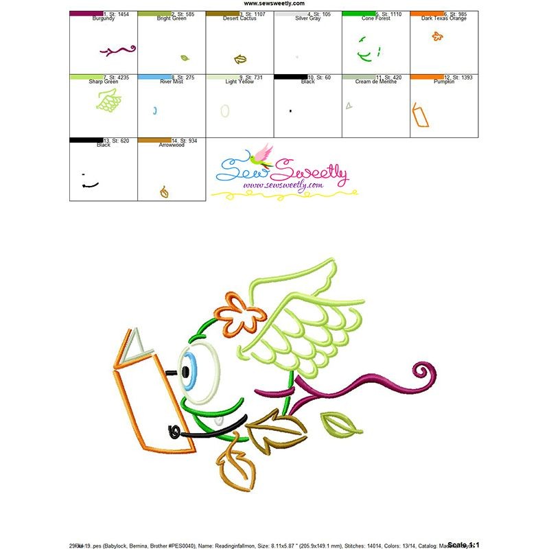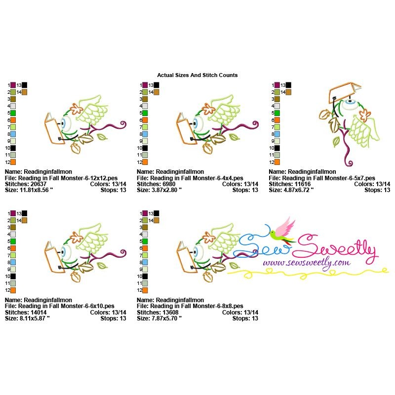 Reading in Fall Monster-6 Machine Embroidery Design Pattern For Fall And Back To School Projects.