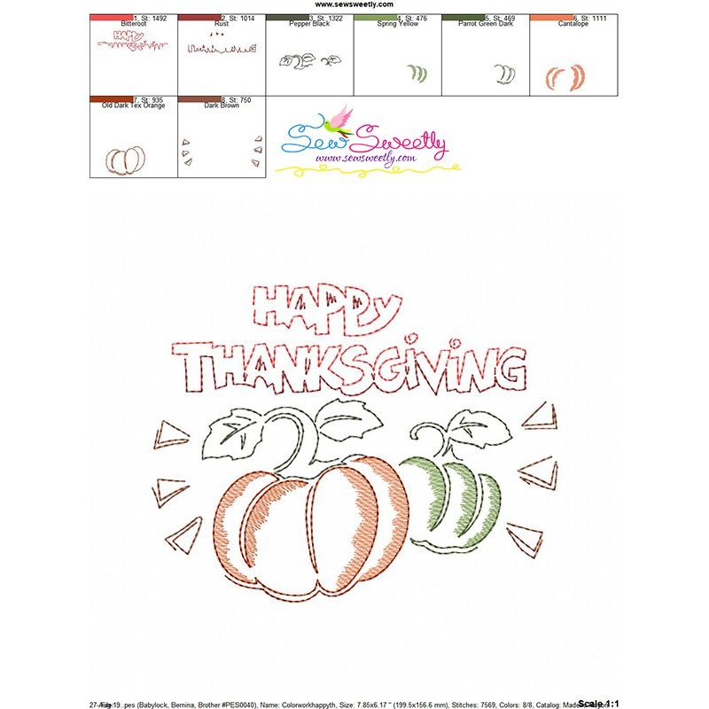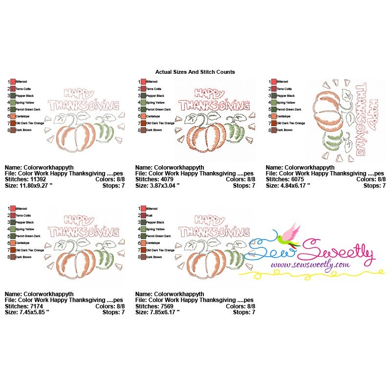 Color Work Happy Thanksgiving Pumpkins Bean/Vintage Stitch Machine Embroidery Design Pattern For Fall/Thanksgiving Embroidery Projects.