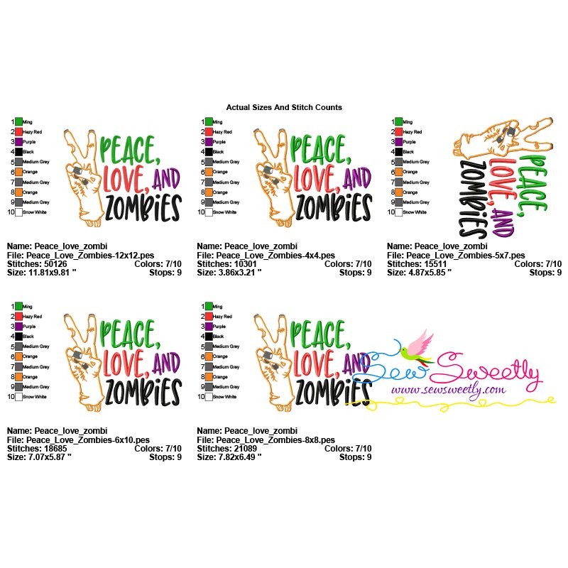 Peace Love Zombies Halloween Lettering Machine Embroidery Design Pattern.