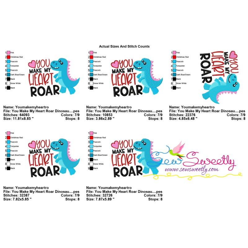You Make My Heart Roar Dinosaur Machine Embroidery Design Pattern For Valentine's Day.