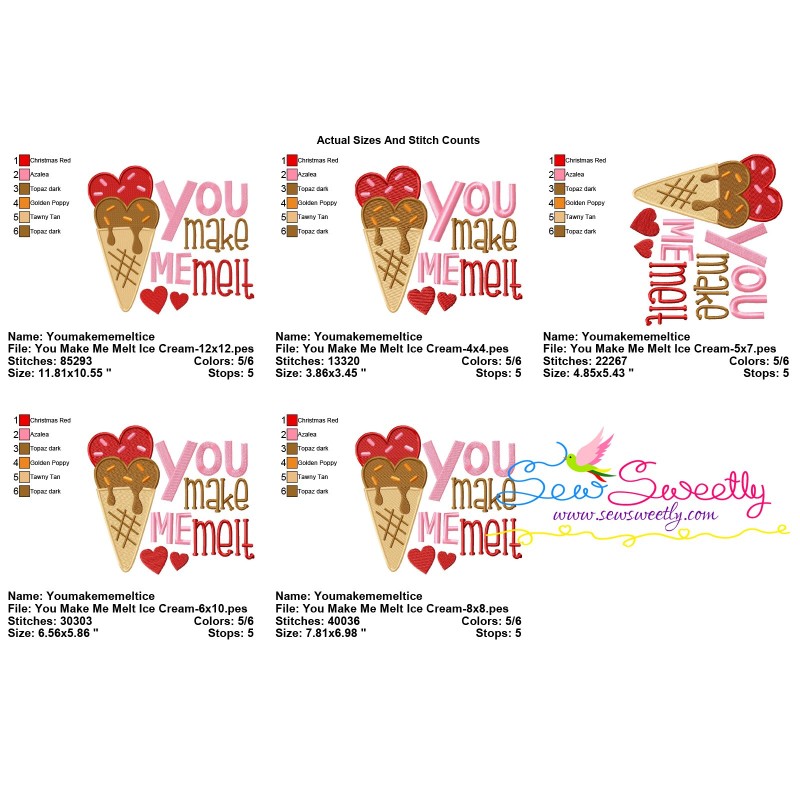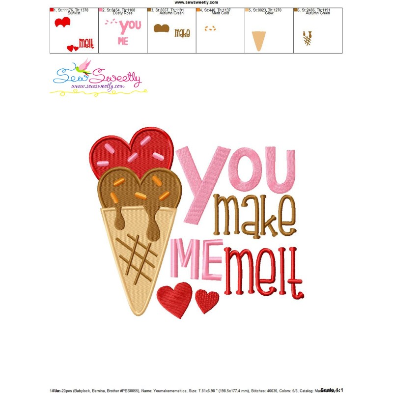 You Make Me Melt Ice Cream Cone Machine Embroidery Design Pattern For Valentine's Day.