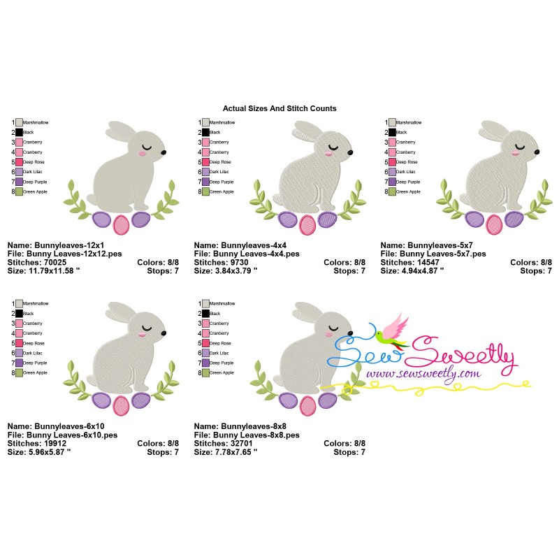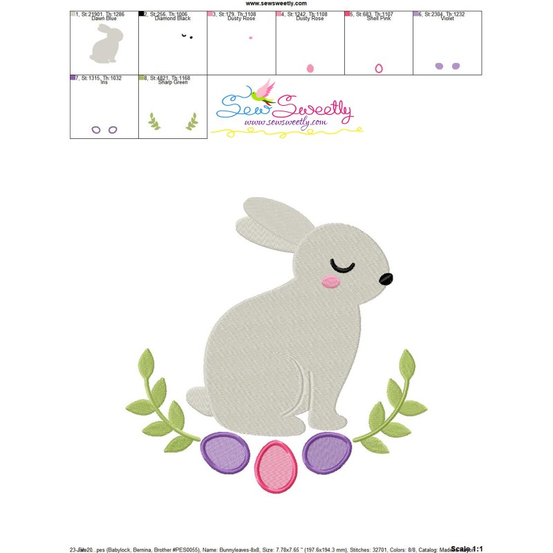 Bunny Leaves And Eggs Machine Embroidery Design Pattern For Easter.