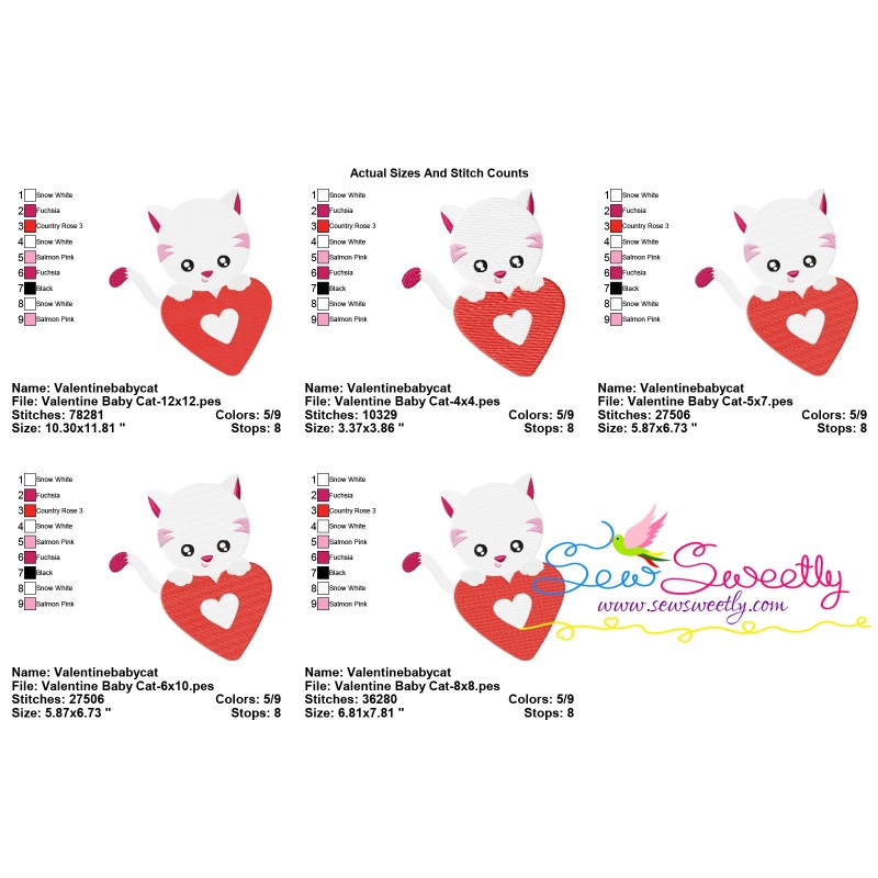 Valentine Baby Cat Heart Machine Embroidery Design Pattern For Valentine's Day.