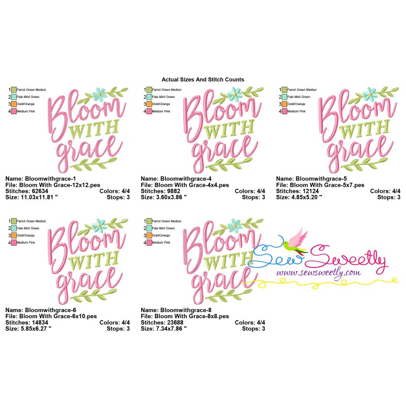 Bloom With Grace Spring Lettering Machine Embroidery Design Pattern For Spring Season Projects.