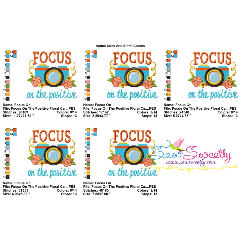 Focus On The Positive Floral Camera Lettering Machine Embroidery Design Pattern.