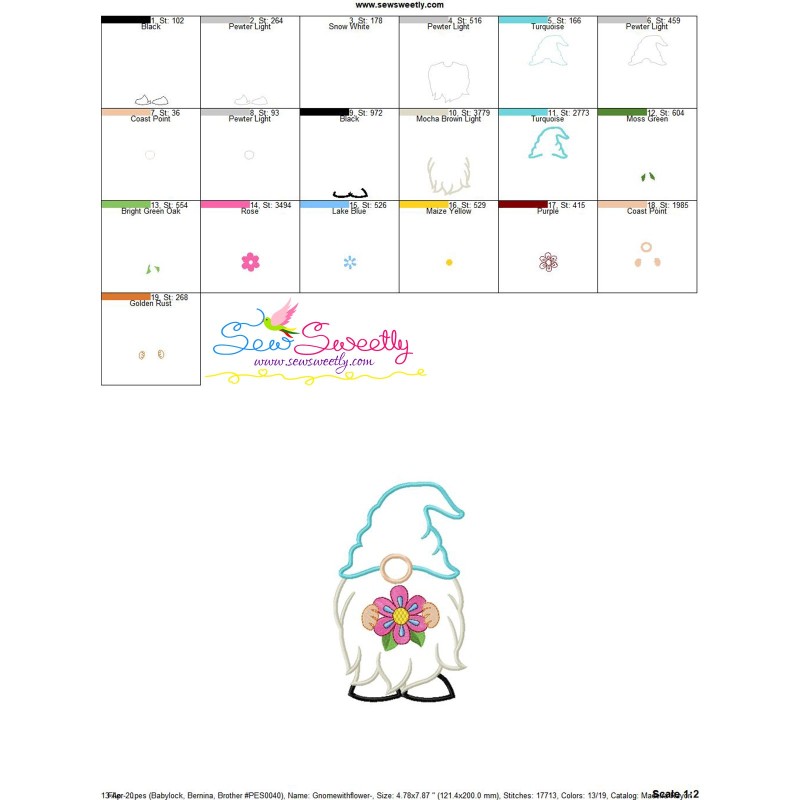 Spring Gnome With Flower Applique Embroidery Design Pattern For Fairytale Embroidery Projects.