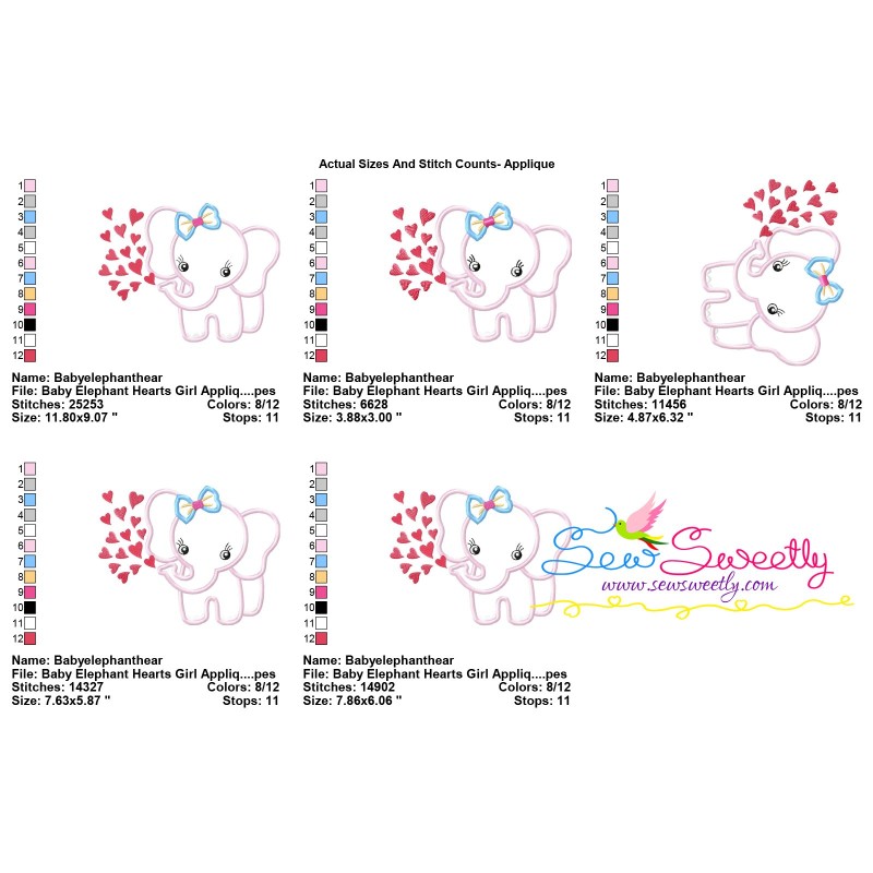 Baby Elephant Hearts Girl Applique Embroidery Design Pattern For Valentine's Day Embroidery Projects.