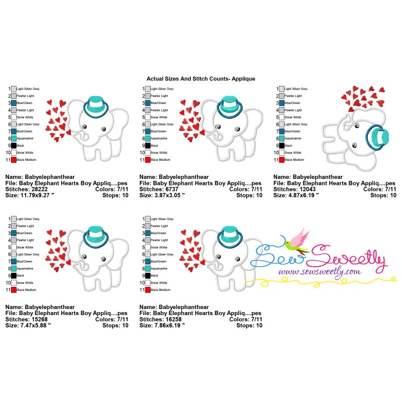 Baby Elephant Hearts Boy Applique Embroidery Design Pattern For Valentine's Day Embroidery Projects.