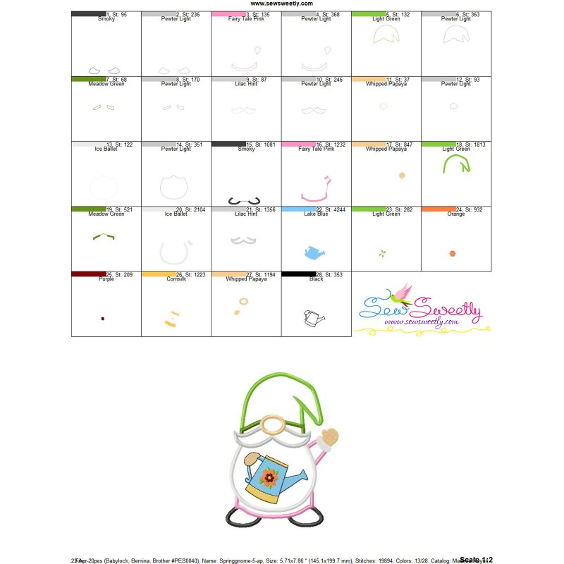Spring Gnome Watering Can Applique Embroidery Design Pattern For Spring And Fairytale Embroidery Projects.
