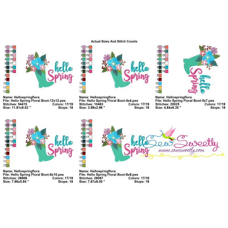 Hello Spring Floral Boot Lettering Machine Embroidery Design Pattern For Spring And Summer Season Embroidery Projects.