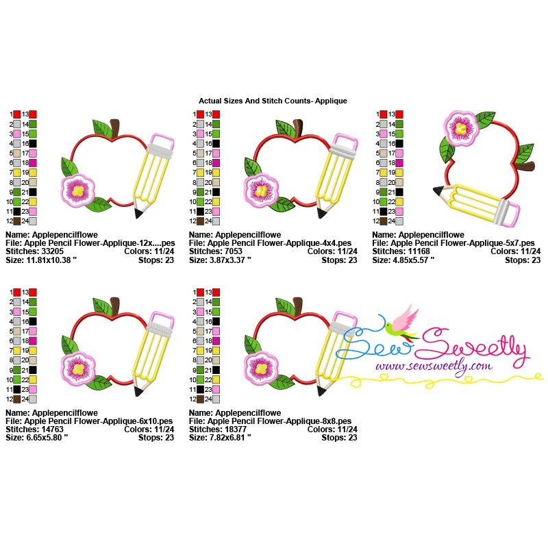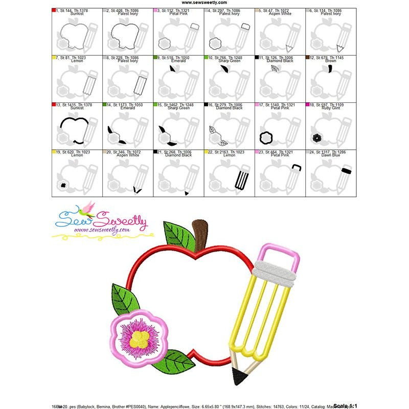 Apple Pencil Flower-2 Applique Embroidery Design Pattern For Back To School Embroidery Projects.