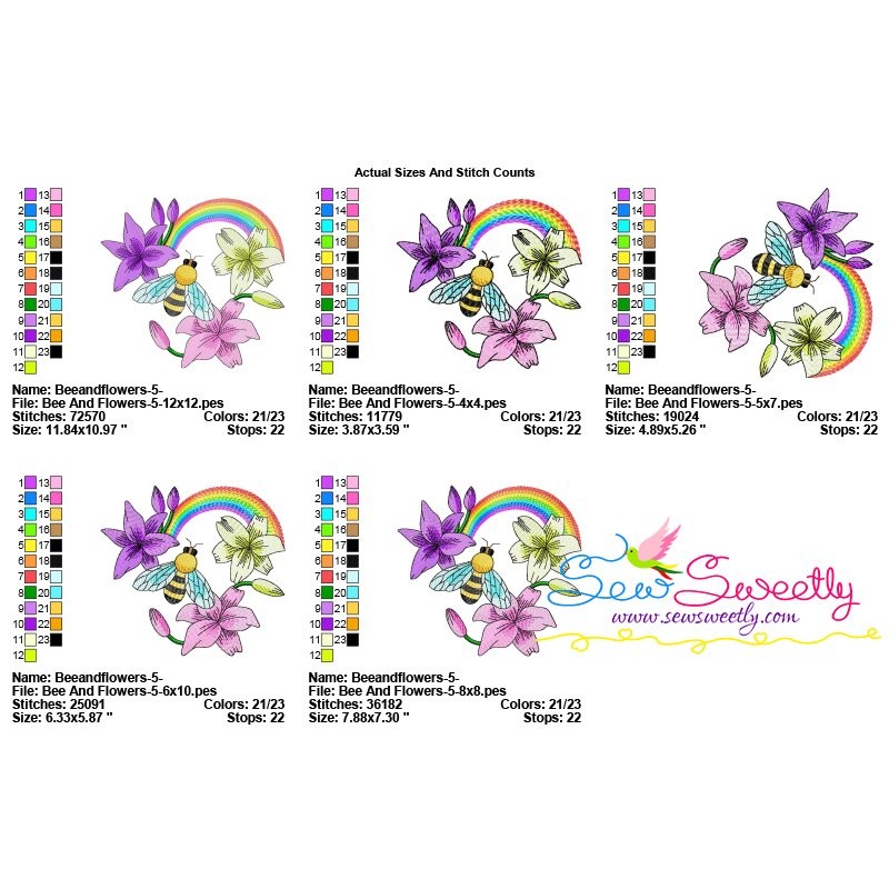 Bee Flowers And Rainbow-7 Embroidery Design...