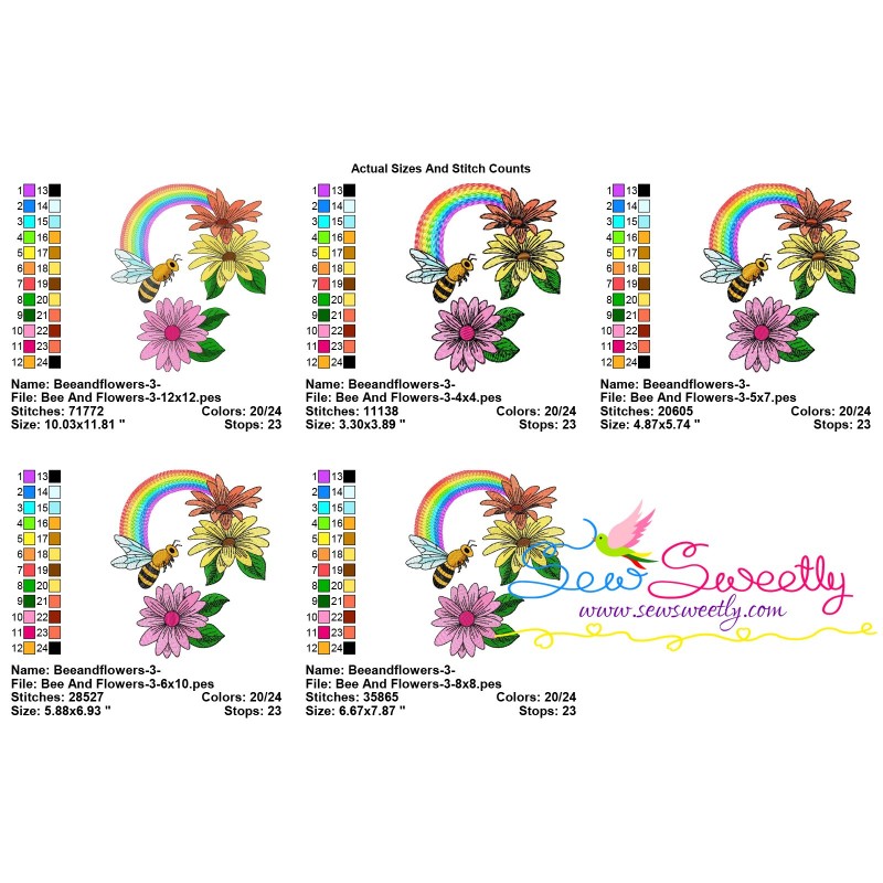Bee Flowers And Rainbow-3 Machine Embroidery Design Pattern For Spring Season Embroidery Projects.
