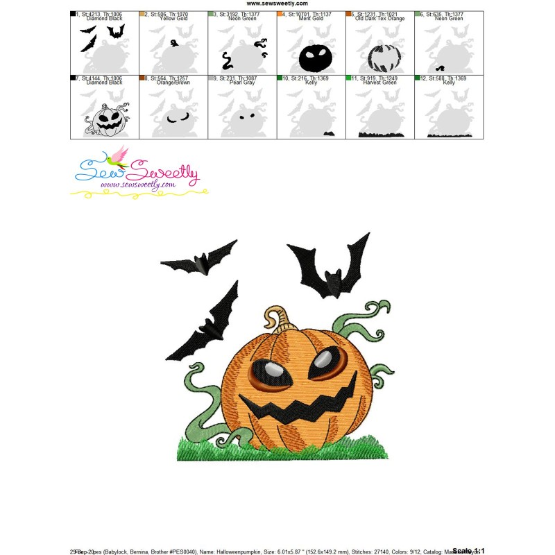 Halloween Pumpkin And Bats Machine Embroidery Design Pattern For Halloween Embroidery Projects.