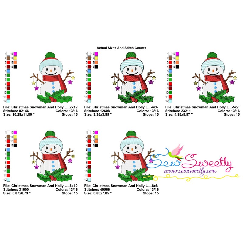 Christmas Snowman And Holly Leaves Machine Embroidery Design Pattern For Christmas Embroidery Projects.