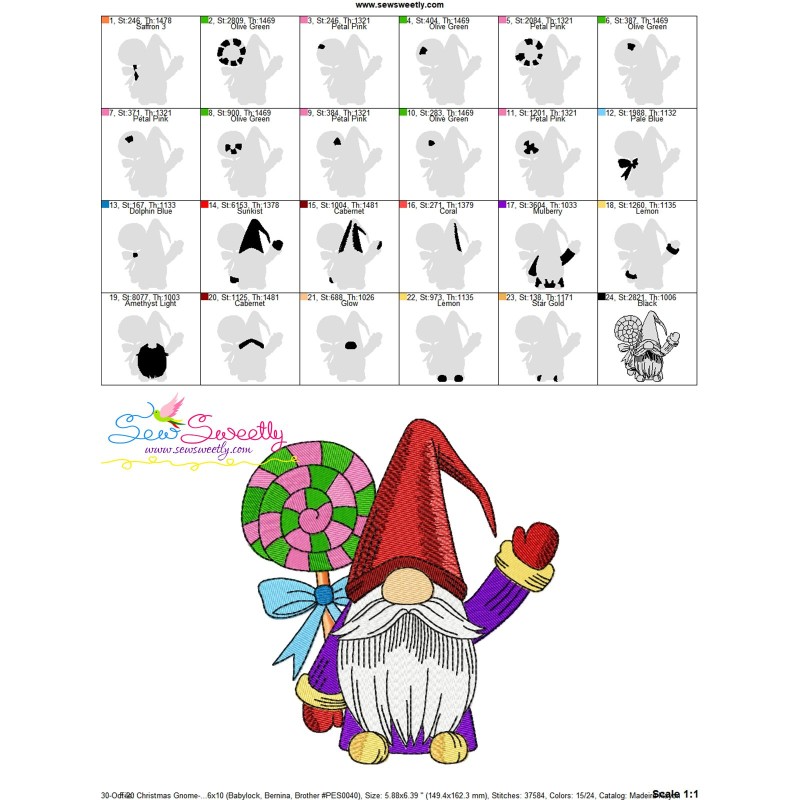 Christmas Gnome With Swirl Lollipop Candy Machine Embroidery Design Pattern For Christmas Embroidery Projects.
