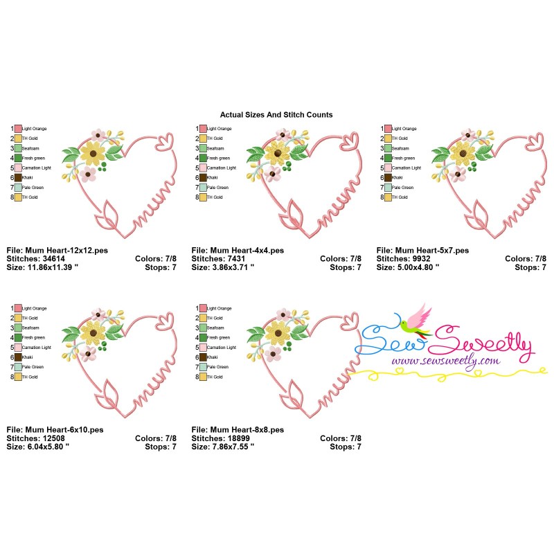 Mum Heart Floral Machine Embroidery Design Pattern For Mother's Day Embroidery Projects.