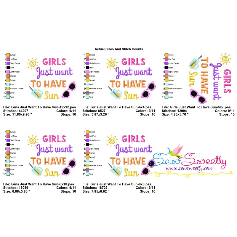Girls Just Want To Have Sun Summer Lettering Exclusive Machine Embroidery Design Pattern For Summer Season Embroidery Projects.