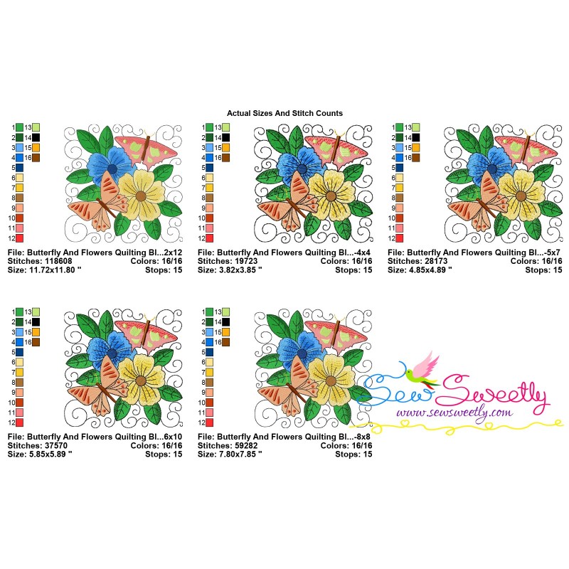 Butterfly And Flowers Quilt Block-1 Machine Embroidery Design Pattern For Quilting Embroidery Projects.