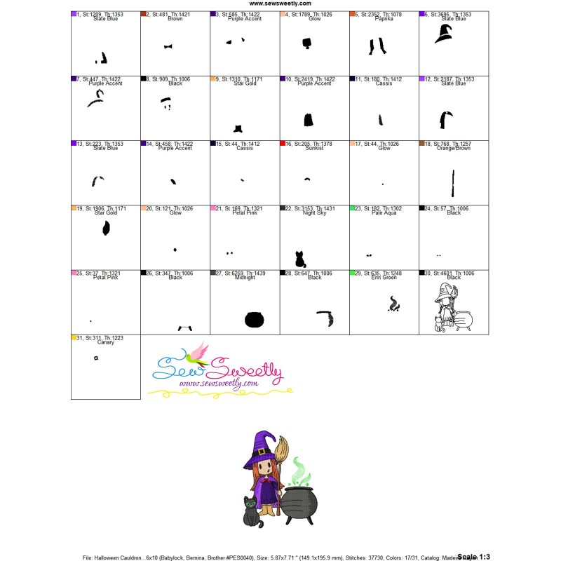 Halloween Cauldron Cat And Witch Exclusive Machine Embroidery Design Pattern For Halloween Embroidery Projects.