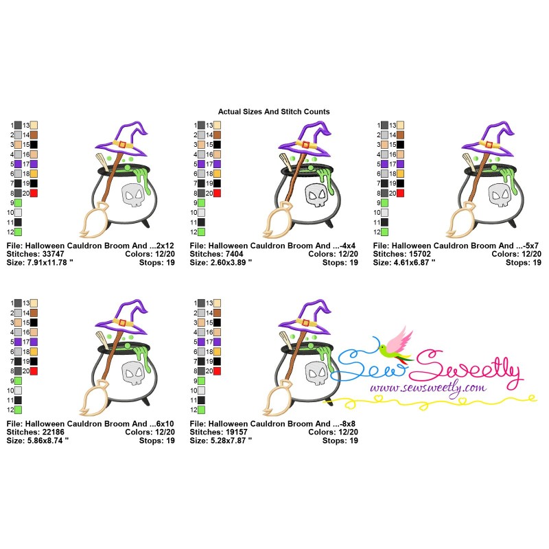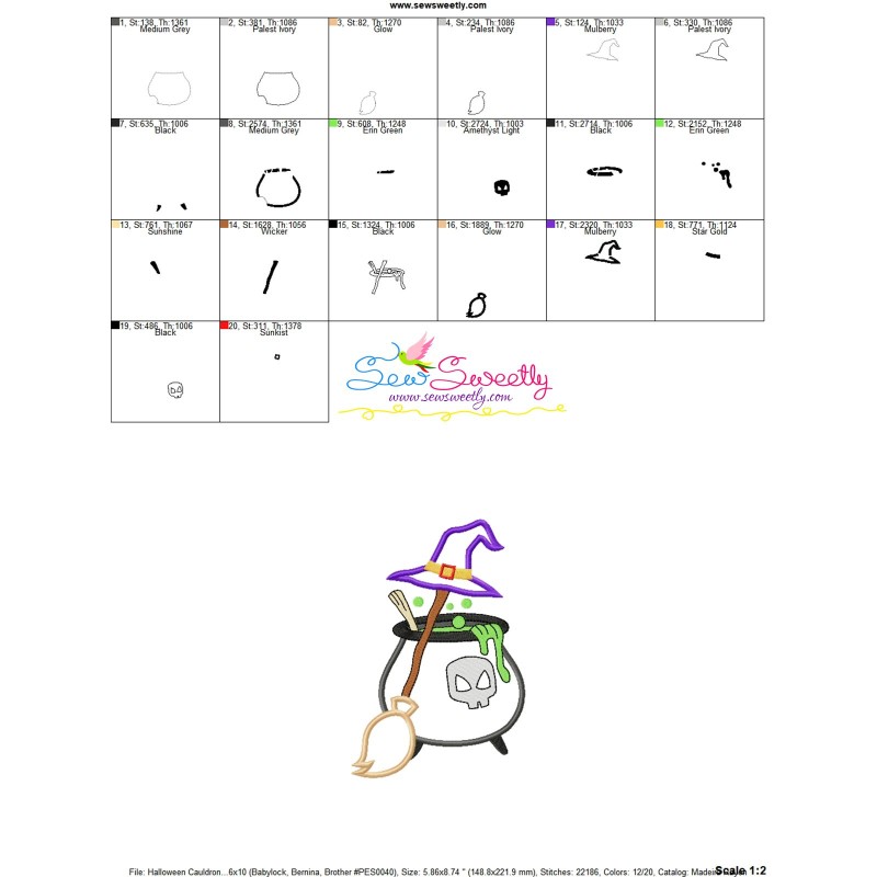 Halloween Cauldron Broom And Witch Hat Exclusive Applique Embroidery Design Pattern For Halloween Embroidery Projects.
